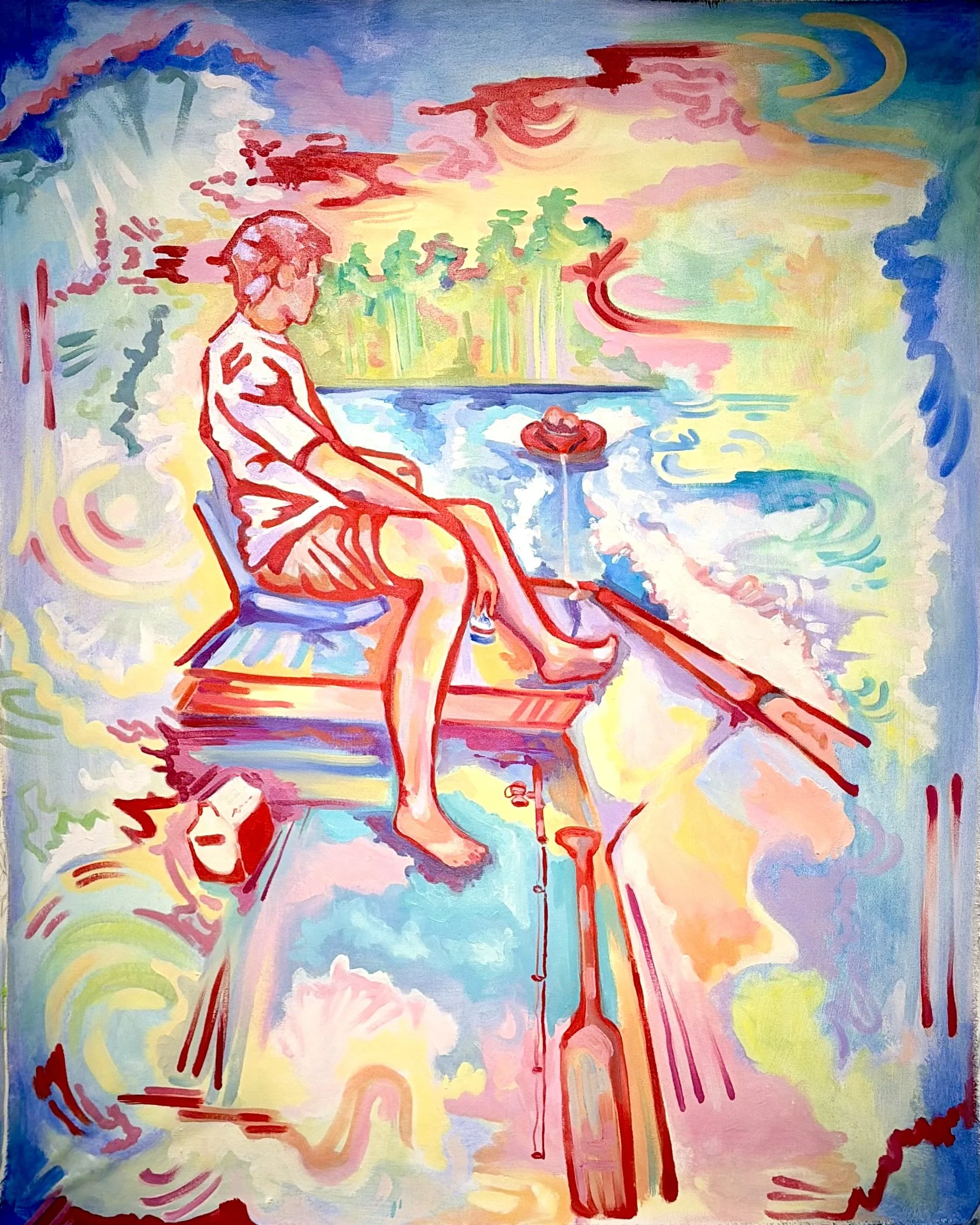On The Water is a preservation of memory from gathered images that my mother took of my dad driving our little john boat on the pond near our home, with me and my sister being pulled on a tube behind. I have a lot of fond memories of being on the water when I was growing up, and this piece captures the feelings I have when I think back. The painting also represents a portrait of my dad, with some of his usual characteristics such as his beloved drink cooler, flip flop tan line, and a natural light beer in hand.