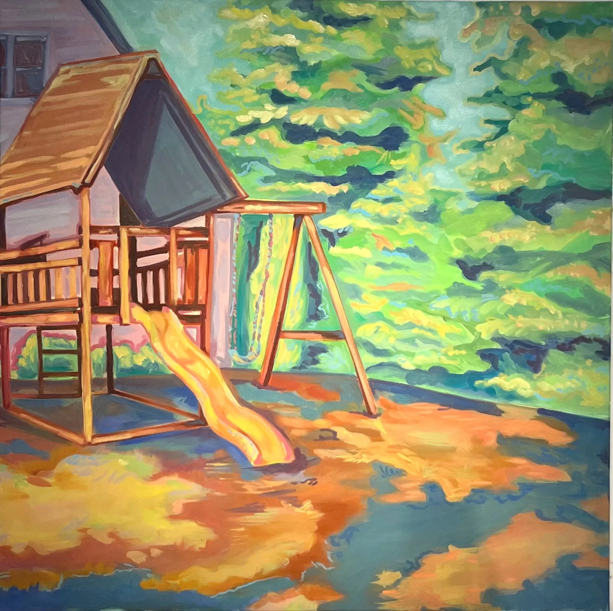 Playset is a depiction of my backyard at my childhood home. The piece holds warmth and a special remembrance of this place and the memories within, while playing around with texture and light within the composition.