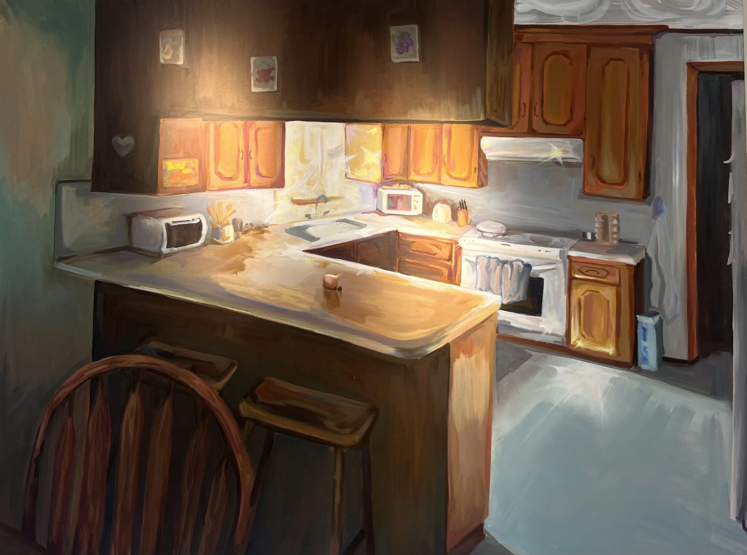 Simmering is a recreation of my childhood home’s kitchen. The space always felt very warm and inviting, whether it be filled with sounds of songs that me and my sister would dance to, or smells of my mom’s cooking. In the daytime the window would let in light that bounced off the countertops and made the room even more cozy. I made this piece with the intentions of capturing those feelings of the kitchen, preserving it permanently for me to carry with me throughout my life.