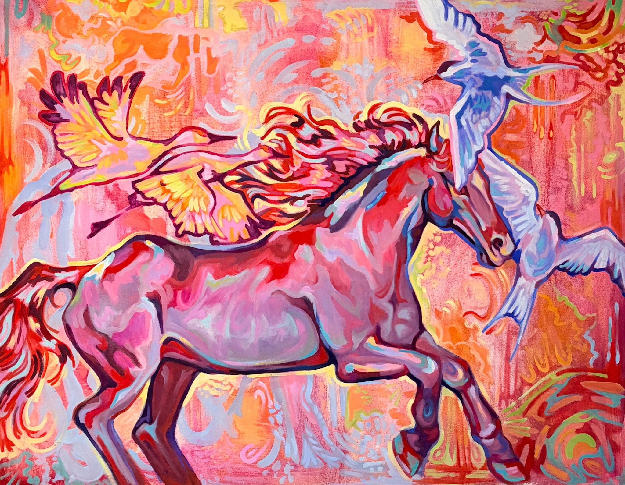 Uprooting is based on my current thoughts revolving around the ethics of mobility within our current polarized political climate. I’ve been reflecting on the contrast between survival drive immigration and my choice to move out of the United States voluntarily. The work does not attempt to equate these experiences, but instead examine the asymmetry between them (who is treated as a traveler vs a threat). I wanted to question what freedom means when mobility itself is unevenly distributed, and to confront the tension between my own personal agency and the systemic inequity that is currently (and has been) taking place in the U.S. The horse functions as a representation of me, embodying chosen movement. In contrast, migratory birds such as the Sandhill Crane & Arctic Terns represent survival based movement, evoking the realities of those who cross borders out of necessity.